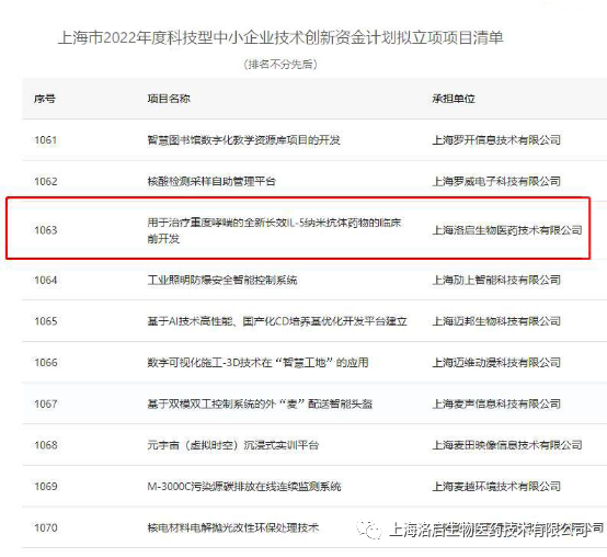 近期,上海市科学技术委员会组织的“上海市2022年度科技型中小企业技术创新资金计划”拟立项项目名单公示完毕,z6com人生就是搏生物“用于治疗重度哮喘的全新长效IL-5纳米抗体药物的临床前开发”项目入围。